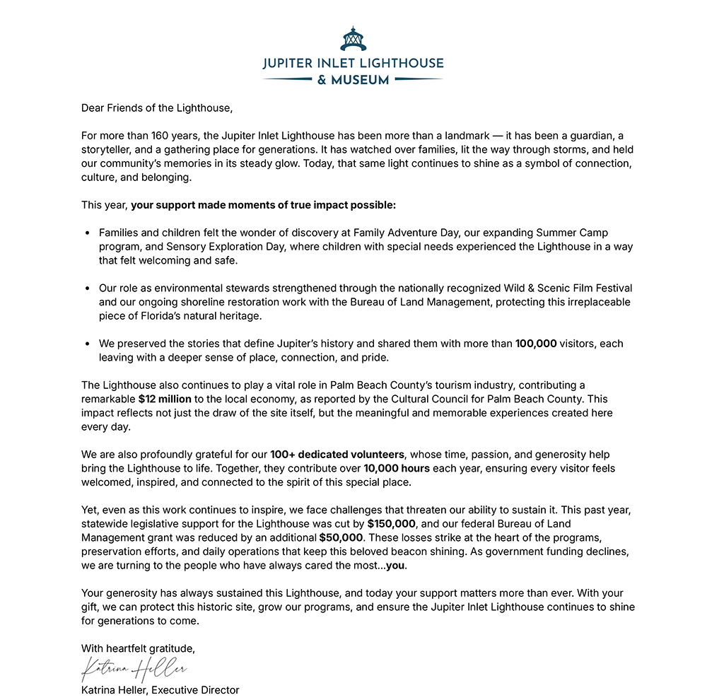 Our Museum is temporarily closed, but there’s still plenty to experience! The Jupiter Inlet Lighthouse, Gift Shop, outdoor exhibits, and scenic grounds are all open and welcoming visitors.